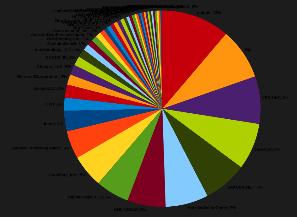 El lector astut s’haurà adonat que això no encaixa amb el que he dit a dalt re: Hetzner i OVH; això és perquè el primer set d’estadística compta cada domini una vegada, i aquest set compta cada IP una vegada. Molts dels dominis a OVH s’allotgen d’una mà d’adreces IP, això és molt probablement a causa de masto.host però no ho he revisat a fons.