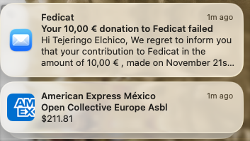 Donçs, tinc missatges contradictoris, per una banda la targeta em diu que em van cobrar els 10 euros, i per altra banda open collective em diu que van declinar el cobrament. Però bé, per això serveixen les proves
